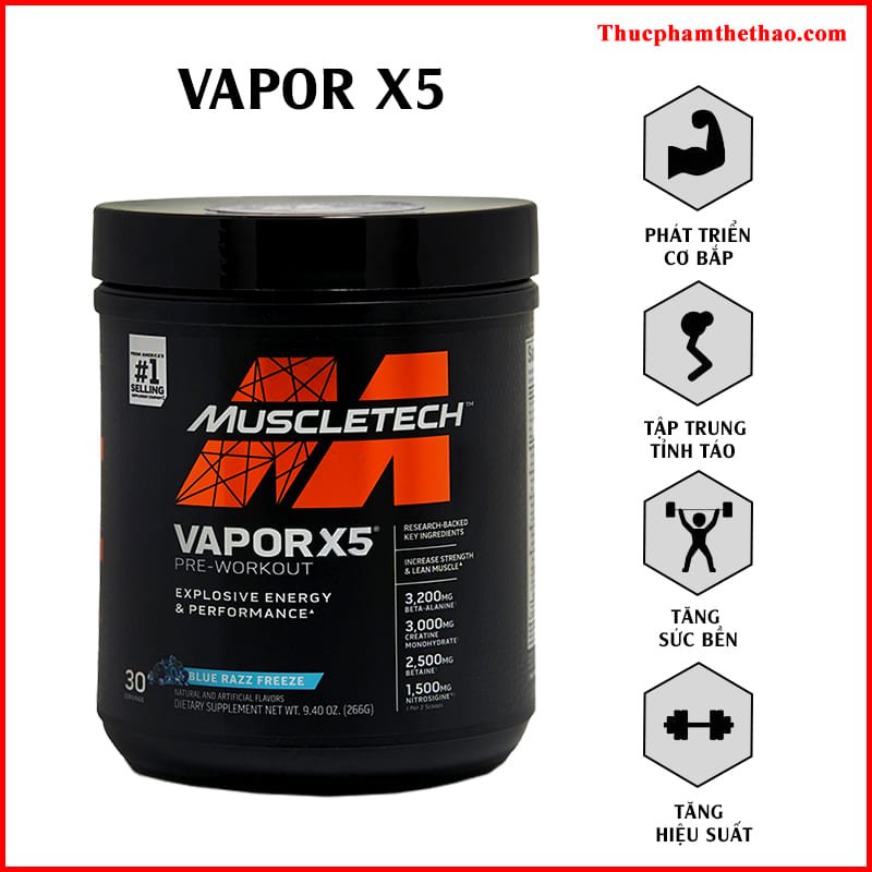 VAPOR X5 NEXT GEN là một sản phẩm tăng sức mạnh được Muscletech thiết kế nhằm giúp cải thiện hiệu suất tập luyện. Tăng sức mạnh - hiệu suất - sức bền và nâng cao tỉnh táo, giúp tập trung cao độ. Đây là dòng #Pre-#workout 5 trong 1 duy nhất với đầy đủ các thành phần chính:
